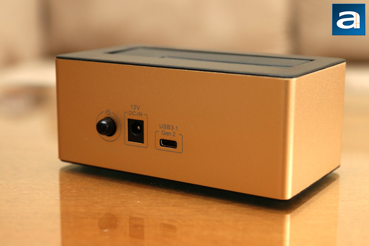 Turning to the back, we have several more input and outputs. From the farthest left, we have a small push button power button. Next, we have a 12V DC power input to keep the docking station and attached drives powered. The provided adapter allows this docking station to pull up to 2.0A, which translates into a maximum 24W power draw. This should be more than enough, as drives generally do not pull higher than 10W in terms of power consumption. Finally, we have a USB 3.1 Gen 2 Type-C port, which is used to transfer data between the connected computer and the docked storage disk. With this reversible port, this means you can plug the cable in either way without having troubles. As well, this is the second generation of USB 3.1, which supports up to 10Gbps data transfer. In theory then, the bottleneck is actually with the Serial ATA interface, as the fastest SATA III has a maximum 6Gbps data rate. Once again, we will see what this means when we actually run some tests with the SilverStone TS-11C.
