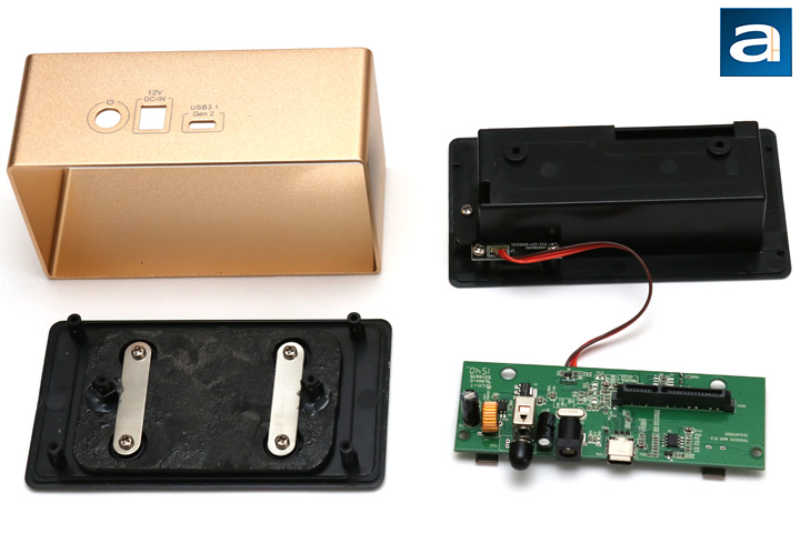 Unlike the SilverStone TS12 we reviewed recently, the TS-11C can be taken apart by loosening the screws found near the SATA drive connector. This is found underneath the flap of the docking station. After removing the screws, you can get to all of the parts inside the SilverStone TS-11C. On the left of the photo above, we have the single piece gold aluminum enclosure of the TS-11C. Underneath, we have the base of the device. A metal weight is attached here to ensure the whole docking station stays upright while a drive is installed. On the right side, we can see the plastic top with a wire connected to a small printed circuit board. This board holds all of the hardware components, including capacitors and multiple chips. The largest one is the ASMedia ASM1531, followed by an ASM1542. According to the manufacturer's website, the ASM1531 is a USB 3.1 Controller to bridge between USB 3.1 and the Serial ATA interface. The ASM1542 is a 10Gbps signal passive switch.
