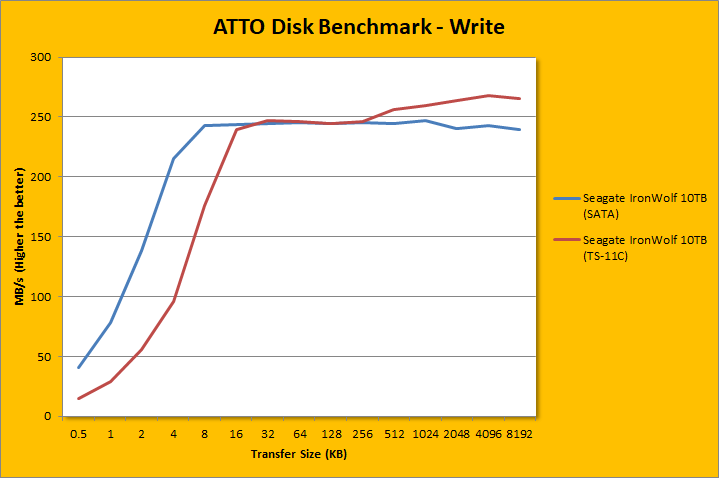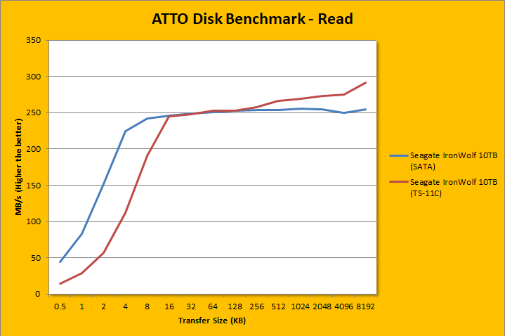 In the tests today, only one benchmark is used for the performance evaluation. The focus of this test is to evaluate the performance of the interfaces on the docking station instead of the performance of the storage device itself. Theoretically speaking, data needs to be sent out from the hard drive and go through the SATA interface first, and then pass through the USB 3.1 interface to the computer. The reverse applies to data going from the PC to the HDD. The actual data rate will depend on the slowest link in the chain. On paper, SATA III supports 6Gbps data rate, and USB 3.1 Gen 2 can max out at 10Gbps, therefore the USB interface should not be the bottleneck. Does the theory really work in reality? Is there any difference between using the docking station and connecting the hard drive directly your computer via SATA? One comparison experiment can find out the answers. We used a Seagate IronWolf ST10000VN0004 10TB for the data rate tests using ATTO Disk Benchmark.