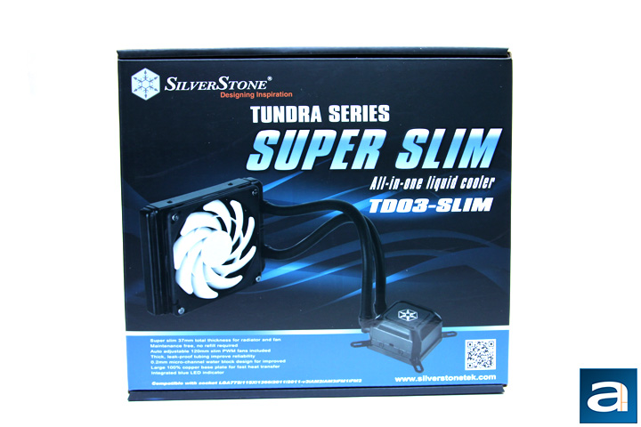 Just like the SilverStone Tundra TD02-SLIM, the box is in color, which is different from some of the other water coolers from the Tundra series like the TD03-LITE. It is a simple design, with the front of the box displaying the product and showing off how slim it is. The blue and white color scheme reinforces the water cooling, as well as its Tundra series namesake. On the bottom left of the box is a quick rundown of the selling points of the product. The socket compatibility list is really just all modern motherboard sockets for both AMD and Intel. On the back of the box are features listed in different languages and some support features. The left side of the box shows off the super slim aspect with a side view of the product, while the right of the box just has another picture of the TD03-SLIM. Where it all becomes a bit more technical is the top of the box, where all the specifications are found.