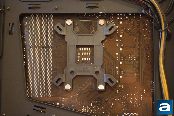 I did not require the manual for the backplate installation, since it was a very simple process. However, I did check the manual to make sure it made installation clear, which it did. As well, the same backplate was used for both Intel and AMD sockets. The screws that are used have their heads cut in half, ensuring they stay in place during the water block installation, while avoiding over tightening. On the other side of the motherboard, there are four little plastic stand offs to keep the backplate from falling off while you are preparing for the next part of the installation. The stand offs can be seen more clearly in the next picture.