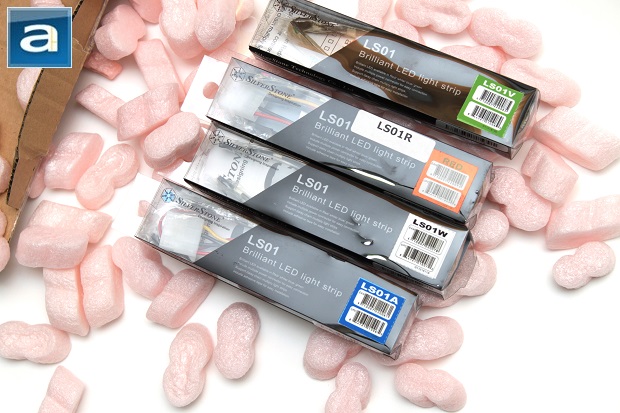 Pulling our lights out of the box, you will see here that SilverStone is kind enough to send us all four colors for us to sample, packed with a bunch of packaging peanuts. Their choice of packaging is pretty mainstream; the LS01s are sent with plastic boxes with features printed on each box. Each one is clearly labeled with the color codes as well to show which one you have received out of the four available color choices. With that in mind, you can't really add to much more to such a simple packaging.