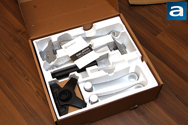 After removing the SilverStone ARM Two from the shipping box, I found its retail packaging design to be pretty down to earth. As you can see in our photo above, it yet another brown corrugated cardboard box with black printing on it. Was I expecting pretty pictures? Not quite; after all, if you are working at your company's IT department order ten or so of these for your coworkers, any fancy retail box will just end up in the recycle bin downstairs anyway. I think SilverStone has done a good job here in designing correctly for the target audience. As you can see in our photo above, SilverStone's logo can be found at the top left corner, while the specific mounting variant is marked on the right hand side. A drawing of the ARM Two is shown prominently across surface; just below the model name. One thing you cannot really miss is the big "MIT" badge near the left. In case you are wondering, this has nothing to do with the Massachusetts Institute of Technology. Instead, it simply stands for "Made in Taiwan", used to signify its quality manufacturing and assembly. We will see how true this holds as we progress through this review.
