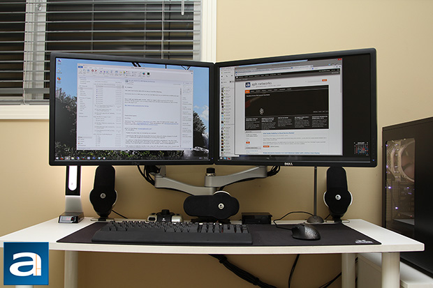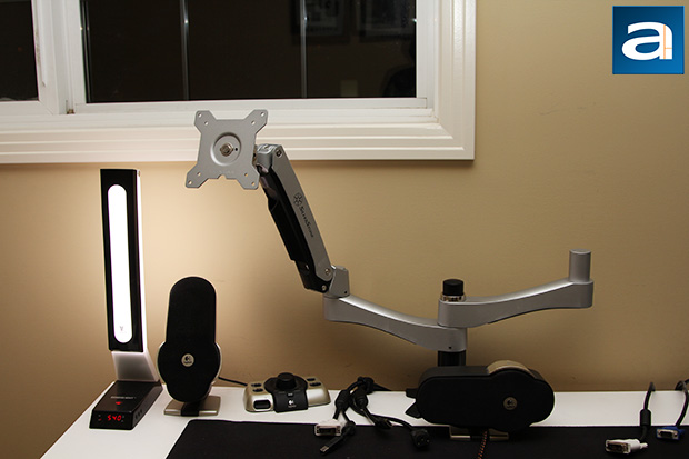 Over the years, I have owned many Dell UltraSharp LCD monitors. The first one I have owned is a 2005FPW roughly nine years ago; an exceptional 20" 16:10 widescreen LCD featuring a brilliant 8-bit S-IPS panel. Since then, I have tried to own monitors of other brands, and even ventured into ones equipped TN panels -- but I have always come back to premium UltraSharp monitors for my main setup. Its picture quality, features, and price is simply unmatched by any other manufacturer in the market today. Besides picture quality, Dell UltraSharps also ellipses other brands in terms of features. This includes stuff like a bajillion inputs, built-in card reader on high end models, and of course, the all-important height adjustable stand. Why is the height adjustable stand so important? Well, if you have been tilting your monitor back all these years, try straightening it out and raise it to eye level with some textbooks -- it makes a world of difference. However, while having a height adjustable stand is awesome, it has one significant limitation: Placement. In the past, I could not establish a dual 24" screen configuration in my room, simply because my desk is too small. Furthermore, spanning two 24" monitors across would have been too wide; making the view a pain in the... neck. But when my 2408WFP decided to kick the bucket a few weeks ago, I decided it was time for a change. With the SilverStone ARM Two SST-ARM22SC articulating monitor arm, not only could I place two 24" monitors on my desk, but I could do so while placing them at eye level, and angle them in aggressively so I can view across 3840 pixels without hurting my neck -- all without taking up any room on my desk. For a competitive price of about $200 at press time, is this your Ergotron killer? We took one in along a pair of UltraSharps to find out.