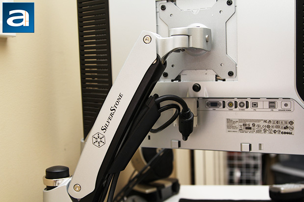 Here is a shot at the back of the SilverStone ARM Two SST-ARM22SC with a monitor installed. Each arm has SilverStone's logo displayed proudly in the middle. If you are putting the whole thing together yourself, I would highly recommend you to attach the second segment of the arm to the monitor on the ground first, and then pop it in place afterwards. My Dell UltraSharp monitor already has VESA mount screws pre-installed from the factory, so I used those instead -- but SilverStone provides them in case your monitor does not come with any. The ARM Two supports VESA MIS-D 100 and MIS-D 75 specification; in layman terms, this simply means hole pitch of 100mm by 100 mm and 75mm by 75 mm, respectively.