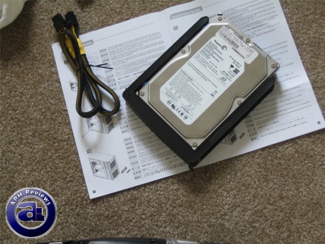 Anyways, drive installation is really simple -- the 5.25" drives are simply slide-it-in-and-go. The 3.5" internal drives are accommodated with a bracket to slide into one of four bays like a drawer in the drive cage. Four screws are mounted on the standard attachment holes on the hard drive; rubber dampeners are placed on both sides to reduce vibrational noise generated by the bracket and hard disk contact.
