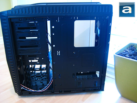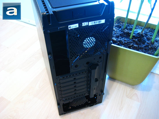 On the flipside of the case, there are many features that are also commonly found on modern cases. Starting from the top left, we have room for the motherboard I/O backpanel; to the right is a single 120mm fan for rear heat exhaust. Located below that are two cutouts for watercooling tubes, and seven expansion slots openings. The SilverStone Precision PS05 features a screwless installation system for its expansion cards, again we will cover in detail later on in this review. At the very bottom is a the power supply bay for bottom mounted units. According to the specifications, it has "unlimited space" for long power supplies.