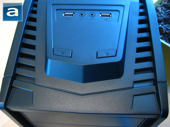 As stated earlier, the top of the chassis is where the buttons and the front panel connectors are located. These are all slightly elevated off the platform in a shield-like shape. The inputs are then slightly recessed into the surface; going from the left side to the right side, we have an USB 2.0 port, two 3.5mm audio jacks, and a second USB 2.0 port. The reset button is located on the left side near the bottom of the shield shaped platform; while the power button is found at the opposite corner in this location. It would be nice to see an eSATA and Firewire port, especially the former since they are so rampant and used quite often nowadays. Either way, the top of this PS05 is good in terms of utility, but the plastic looks a bit cheap. Do keep the budget price of the PS05 in mind, however.