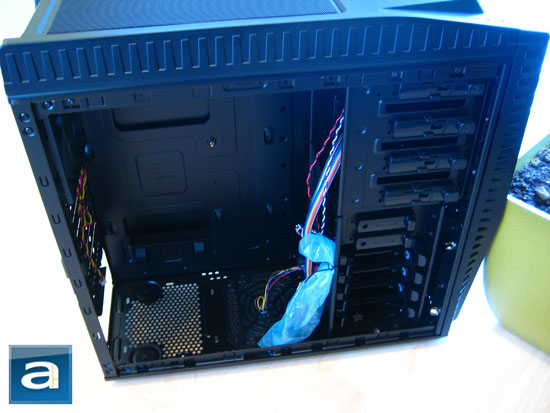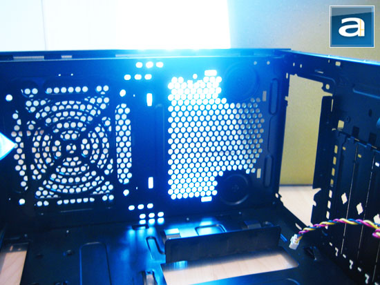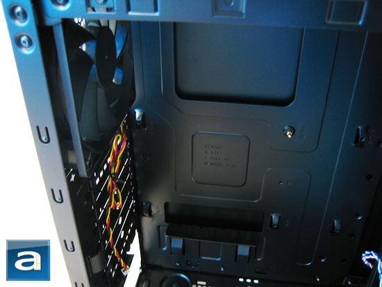 Here you will find a large square cutout on the motherboard tray for easy installation of aftermarket heatsinks with backplates. This mitigates the need to remove the whole motherboard from the chassis itself when swapping out your CPU cooler. This can be a very convenient; and it looks like even if you have a shifted CPU socket like the ASUS P7P55D-E Premium, the opening is large enough to accommodate the latest LGA 1155 and LGA 1156 motherboards.