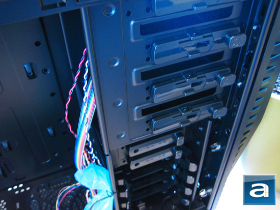 Above these four 3.5" drive bays are two 3.5" external drive bays and four 5.25" drive bays, as discussed earlier in this review. They all feature tool-free installation, as with the hard drive trays. Again, they work quite well; creating a nice fit that is relatively secure. If you ever feel the need to go beyond these locks, the other side of the case has screw holes. Even though it was secure enough for most cases, I personally preferred a little more snugness, so I attached additional screws anyway. In terms of being a tool-free solution, the SilverStone has done a commendable job with the Precision PS05 in my opinion.
