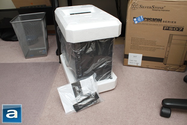 Pulling our goods out of the box, we have the Precision PS07 wrapped in a plastic bag, and sandwiched between two foam brackets to prevent bumps, bruises, and miscellaneous scratches during shipping. You will also find a small bag containing the user manual and some accessories to accompany the case. Without further unpacking it from its protection, I already have a good feeling that this case will suit my little 'office' very well -- but before we unpack the excitement, here is a little table of specifications, as obtained from the manufacturer's website: