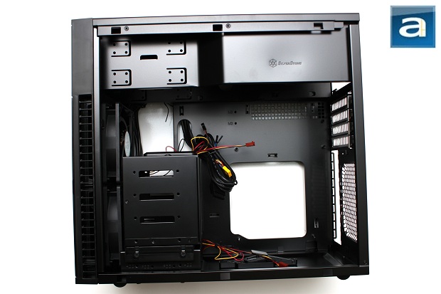 From this angle, you will see the motherboard tray, as well as the back of the Precision PS07. The power supply has its own little distinctive space by means of having it lowered from the top after the top panel is removed. An array of square holes are situated between the motherboard tray and the power supply bay, with the usual expansion slots, motherboard I/O opening, and honeycomb mesh for the rear exhaust fan. A nice feature already implemented is some motherboard risers are already permanently mounted on for you. These are the standard risers that are always needed, so it is nice to have SilverStone do half of the job for you out of the box. As well, there is a fairly large opening to accommodate aftermarket CPU coolers with custom backplates. Although you may not be fitting too large of a cooler inside, it is nice to know that it could still accommodate the larger types for those who have the desire to. Also to note here is if you are having a hard time with your motherboard for whatever reason, the motherboard tray can be detached for your needs. If you happen to be one of the lazy ones who don't want to detach and reattach the tray, mounting the motherboard and wiring everything neatly is possible too, in which you will see on the next page.