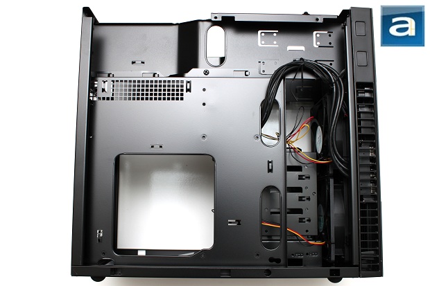The front of the case has two 120mm intake fans, as mentioned previously. Both these fans are rated at 18 dBA of noise, and spins at 950rpm. A hard drive rack is situated right behind the fans, which can accommodate five 3.5" hard drives; the bottom bay can accommodate one 2.5" hard drive or a solid state drive as well. The hard drive rack itself can be taken out completely for easier management of components. On top of this area are the optical drive bays, which could also be accessed once the top panel is taken off, much like how you would access the power supply area. Again, personally, I would have preferred some sort tool-free clips here to hold the hard drives and optical drives in place without having to pull out my screwdriver. From this angle, you can also see the CPU cooler support. If you think your cooler is putting a little too much stress on your tiny motherboard, this is a great tool to use to give a boost in reducing stress.