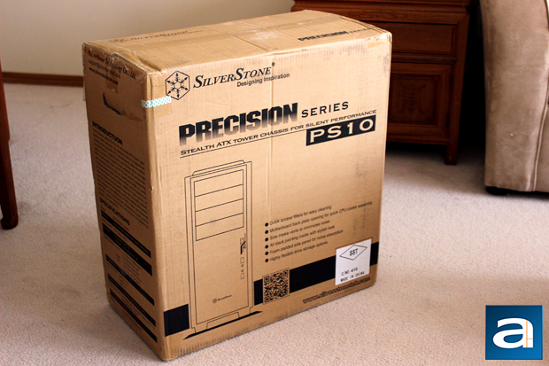 The SilverStone Precision PS10 arrived at our APH Networks headquarters in Calgary, AB via UPS Standard. The box itself is in good condition, but there is a sizeable hole on one side, so I can only hope it did not cause any damage to our actual product inside. Our review unit arrived from SilverStone’s headquarters in Chino, California, where quite a few of our partners are located. This small city holds approximately seventy eight thousand people, and is more known for its agricultural and dairy farming rather than its technology. Chino is also located quite close to another small city named Ontario, whose mayor is not at all related to Toronto mayor Rob Ford. Unfortunately, if you do a quick internet search of “Ontario, CA”, you probably will see quite a few more Canadian websites rather than Californian. But shifting back to the actual topic at hand, the shipping box, which is also the retail box found in any store, is a standard brown corrugated cardboard box. Text is printed on the box in black ink. Of course, some manufacturers do not really care much about the box design, as they all know it is what is inside that counts. On the top left hand corner is SilverStone’s logo, with the Precision series line underneath. Just for your information, the Precision series is aimed for budget-friendly builds, which are functional and light on the wallet. While there are several different chassis in this line, they are not all focused on the same kind of feature, but rather making cases varying in size and purpose. The PS10, as you can read from the box, is meant to be a “Stealth ATX tower chassis for silent performance”. While I could only wish for an invisibility button on the SilverStone Precison PS10, the stealth actually refers to the silent operation the PS10 promises to offer. The rest of the features are listed on the front, as well as more specifications on the side.