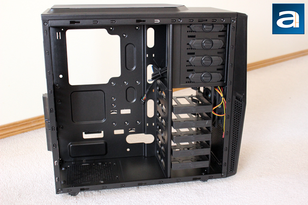 Turning the PS10 to the back, we can see the other side of the motherboard tray. Like most computer chassis, the back is utilized for hiding those long, snaking cables and wires, to keep the front area nice and clean. Unfortunately, the SilverStone Precision PS10 does not offer very much in terms of back clearance. The hole placements themselves are actually quite ideal and work very well for cabling, but it would be nice to have a bit more room. This is accentuated even further considering the foam itself also takes a bit of clearance away. While the protruding sideburns are supposed to provide more space, the problem still exists. Looking at the front, we see where all the 5.25” and 3.5” drives go. At the top, of course, are the 5.25” disk drive slots, and the SilverStone Precision PS10 provides us with four sets of tool-less clips to mount the drive without any screws or the such. Underneath the area is the 3.5” hard drive bay, with five trays that slide in and out. The drive bay area itself is permanent and cannot be moved around, but this is not an issue as it does not get in the way of anything else anyway. Each of the five trays still require screws to mount the hard drive itself to the tray, but sliding in and out is quick and simple. As well, on each tray, there are screw holes on the bottom so you can mount a 2.5” drive, such as a solid state drive or a laptop hard drive, without any problems. As solid state drives are coming down in price, they are a must-have in any build from low-end to high-end.