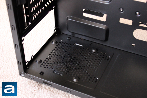 Shifting to the bottom, you can see the vented area holding the bottom dust catcher. If you take a quick glance at the photo, you probably think there are four rubber feet to rest the power supply upon. Unfortunately, this is not the case, as they are actually metal pegs. Rubber feet help hold the power supply in place, and also reduce vibration from the power supply. Of course, not a lot of other cases have them, especially when looking at comparable products. However, we have seen them present in comparable items like the Cooler Master N400 as aforementioned. In the specifications, it says the power supply area is unlimited in space, and while this is obviously not true because the case itself will limit the size of the power supply, most standard size power supplies will fit in the area provided without any issues. Directly above this area are the expansion card slots, with a standard seven slots in total. It should be noted these slots have to be punched out of the back, and there is no way to put them back in. Quite a few manufacturers generally make these areas screwed in, so it can be easily removed and replaced. Unfortunately, this is one of the areas SilverStone decided it was not worth it to add this feature. Again, cost is definitely a concern.