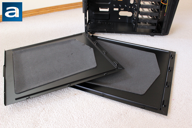 On both of the side panels are two large panes of foam fitting right in where the sideburns are on the exterior. SilverStone claims these foam padded side panels will be great for noise absorption. In the past, we have seen some great cases like the Fractal Design Define XL, which had great sound insulation while not trapping too much heat. However we have seen some real bad ones like the Cooler Master Silencio 550, which do the exact opposite. Our installation and tests will reveal which case the SilverStone leans more toward and I will cover this on the next page. The foam itself is smooth and padded, and feels quite a bit like a mouse pad.