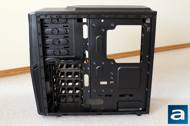 The majority of computer cases nowadays generally do not require many tools for installation, making it convenient for the assembler. The SilverStone Precision PS10 is no different, as the four thumbscrews attaching the side panels are easy to remove, and allow us to take off both side panels to enter within. Inside, all of the panels are black, which matches the stealth theme. Of course, the first color you probably see in the picture is the fan cable that attaches to the motherboard. In terms of wiggle room, the Precision PS10 is not very big. As this is a mid-tower case, there will obviously be sizing restrictions. However, as you will see later on during my actual installation, cable management is a bit more troublesome. Otherwise, the inside of the PS10 is pretty much the same as any other budget-friendly case. For your information, as this is a mid-tower chassis, it is capable of handling ATX and mATX motherboards.