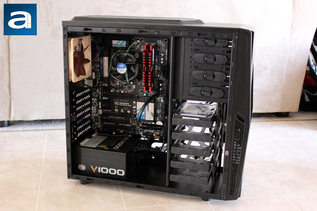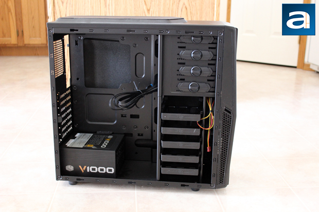 Following APH Networks standards, the first component I plop into the SilverStone Precision PS10 is the power supply. I have had zero issues with this, as the bottom of the case has no obstacles like hard drive bays in the way. I also had an easy time putting a larger power supply like the Cooler Master V1000 1000W without worrying about fitting issues. The next step is to place the motherboard in. The motherboard I placed into the PS10 is an ATX sized motherboard; namely the Gigabyte Z87X-D3H. Mounting the motherboard itself proves to be tricky, as some of the holes were not aligned properly. This means a lot more effort than what is required, especially when putting the risers on. Otherwise, installing the motherboard is not too difficult.