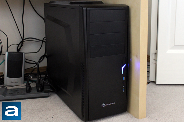 Popping my computer into place, I pressed the cut-out power button, and the system came to life. The blue LED shone brightly, and the red LED mixed in during activity creating a really nice gradient as I have mentioned before. Now we come to the most important part of the review: Sound testing. According to the standard APH Networks sound scale, where 0 is silence and 10 is loudness, the SilverStone Precision PS10 is around a 2.5/10. Note that I did this sound test without the Noctua fan installed, just to provide a better representation from what SilverStone can do. I can definitely say the insulation works quite well, as it blocks out a lot of the fan noise, especially at higher loads. I should also note on average, my computer runs a degree or two Celsius higher than normal, and this is to be expected considering how difficult it is to make a material that is soundproof, but not a heat insulator at the same time. These numbers are a bit better than most budget cases, and I think SilverStone hit the nail on the head in achieving a “stealth” tower.