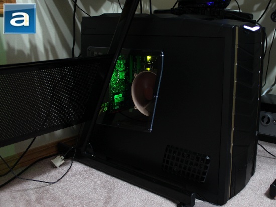 After a quick 30-minute job, I have my system ready to be booted up. Save for what goes on behind the window, your system should look pretty similar to what I have here. Pressing the power button fires up my computer, it turns on the Green Lantern glow emitted from my Gigabyte G1.Sniper motherboard, as well as the white power indicator glow emitted at the front top edge. With both of the bottom mounted 180mm fans running, you would presume that they would be quite loud, especially both of them are running at maximum speed. On a scale from 0.0 to 10.0 where 0.0 is silent and 10.0 is the loudest, both fans running at their lowest setting comes in at around 2.5/10 in my personal opinion. Cranking them up to maximum would bring the noise level to 4.5/10. Of course, these ratings are all subjective in accordance to the end user's preference. If you really have a hard time concentrating, you could always pull the plug on one of the fans. As discussed on the previous page, even if you run the fans at a slower speed, the SilverStone Raven RV03 has some of the most efficient airflow designs, and it is not likely your computer will overheat anyway.
