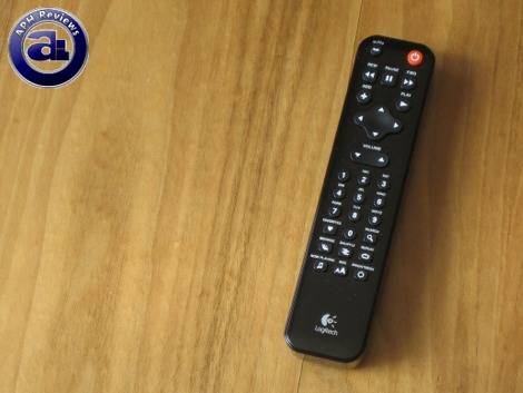 The remote control. This updated revision accommodates and utilizes two standard AA batteries (Included). It also has the Logitech logo on it as well.