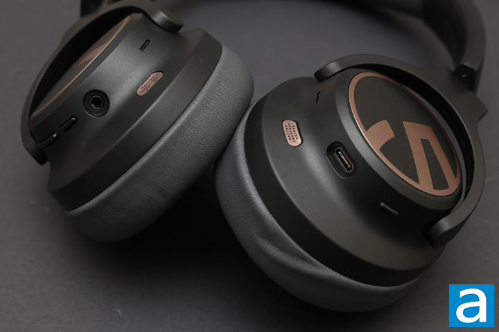 All of the controls on the SOUNDPEATS Space can be found on the bottom of the ears. On the left ear, there is a single button used to cycle between the active noise cancellation and pass-through modes. Next, we have a USB Type-C port nestled inside a slight indentation along with a mesh opening for one of the two microphones, utilized for input and noise cancellation. Finally, there is a small slit housing a small white LED on one edge, which illuminates when the headphones have either ANC or pass-through active. On the other ear, we find a rocker button followed by a multipurpose button. The rocker serves as volume control with single presses and track navigation with long presses. The multipurpose button, when single-pressed, plays or pauses the music. A double press activates the connected device's voice assistant, while a triple press toggles on and off game mode. This game mode is designed to lower sound latency to 65ms for gaming. For phone calls, a single press of the multipurpose button answers or hangs up calls, and a long press rejects incoming calls. Finally, there is a 3.5mm audio jack for connecting to the SOUNDPEATS Space using the included cable.