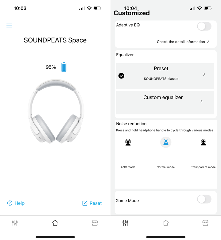Under the hamburger menu, users can access additional settings. At the top, there is an option for adaptive EQ, which essentially adjusts frequencies based on a series of tests to match your listening preferences. I somewhat question the effectiveness of these tests, but it does reveal to users the frequencies they are more or less sensitive to. Next, users can choose between preset equalizers or create their own custom EQ. Personally, I found the preset equalizers to sound artificial, so I opted to stick with the "classic" mode, which maintains flat settings. Below that, users can toggle between different noise reduction modes, including ANC, transparent, and off. Finally, at the bottom of the menu, there are options to activate game mode.