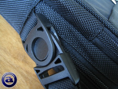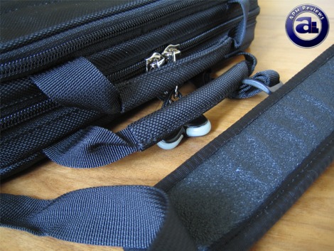 As described earlier, the zippers to the main laptop compartment and secondary compartment extends a certain length down the side of both sides of the bag. At the end of the longer one is the what Spire calls the push button swivel buckles; used for the shoulder strap on both sides of the bag. This attachment allows the strap to be rotated around this location. It works very well, but on the other hand, we would have definitely appreciated more if these clips were made of metal instead of plastic for durability concerns.