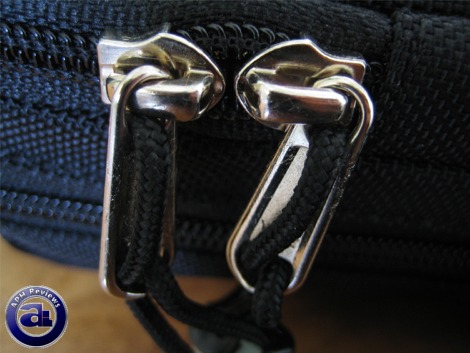 In addition to the two main full height compartments, a half height zipper side pocket is located at the front of the bag. The single direction zipper is the same type used throughout the bag that demonstrated excellent toughness -- and as to complete the series, the glow in the dark zipper attachment is part of the package as well. I slipped my AC adapter into that compartment, and my laptop mouse and mousepad along with a couple of cables went into the full height accessories storage compartment that's next to the laptop compartment.