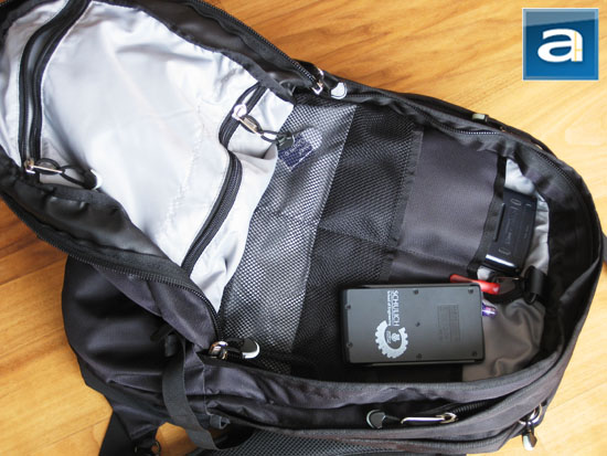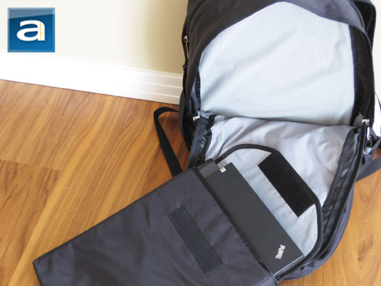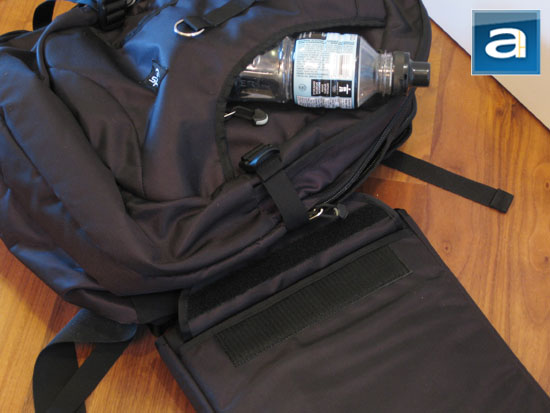Speaking of the Boot sleeve, the above photo demonstrates the back of the unit. A Velcro strip is conveniently located behind another flap, which can be opened and stuck to the corresponding rear wall of the compartment mentioned moments ago. It also acts as a closing flap for a thin pocket behind the Boot's laptop compartment for storing small amounts of paper and other documents.