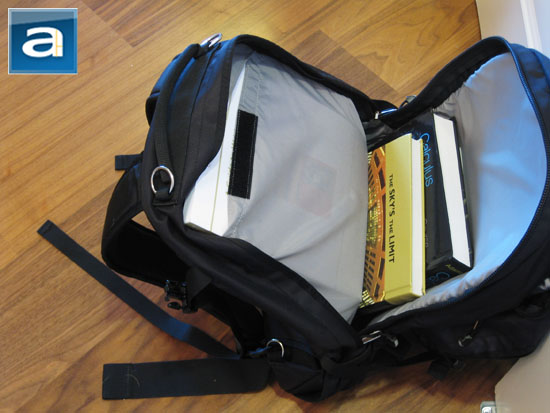 Under the carrying handle at the top is the back compartment; again another full sized partition. As with the rest of the Spire Torq backpack, the openings are sealed with quality and tough zippers. All main compartments opens three-quarters way down on both sides, creating a very adequate amount of loading room. While I would much prefer to have this compartment designed to hold my laptop rather than the middle one, there are unique aspects. The 210 Denier Nylon made interior is durable, smooth, and can literally swallow anything you throw at it. With its deep storage and very generous amounts of room, it made my large calculus and linear algebra textbooks seems small, as shown in the photo above. Let me remind you though: You will be tempted to make the Spire Torq really heavy, haha.