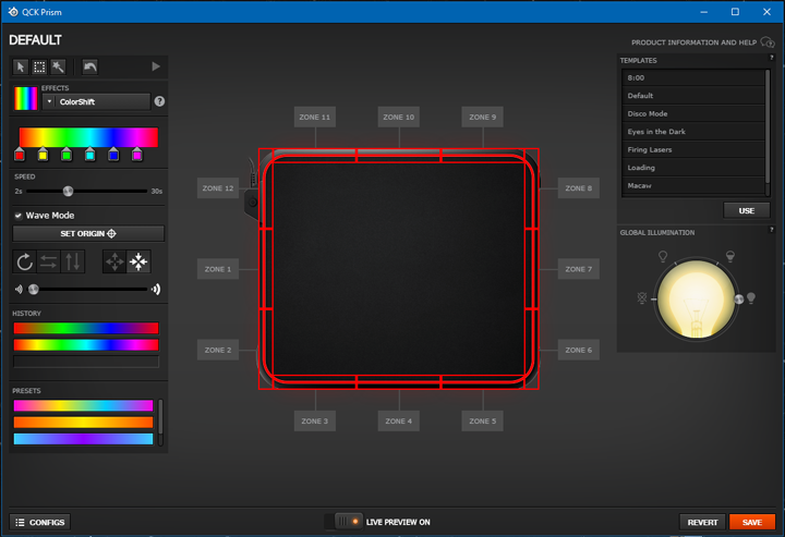 The single main screen of configuration for the QcK Prism allows you to choose the different lighting effects for your mousing surface. The first mode is called "Steady", which allows you to individually pick colors for the twelve regions on the pad. As these are RGB lights, you can pick from one of 16.8M colors. The next mode is called "ColorShift", allowing you to fade between a spectrum of colors, whether rainbow or not. You can also set them to move around the QcK Prism in a wave-like effect. "Multi Color Breathe" mode allows you to set a breathing mode, with different patterns and colors. "Cooldown Timer" mode is pretty neat as it makes for some better game integration. From this mode, you can set a trigger to make the QcK Prism switch to a certain color. After a set amount of time, it will switch back to the original color. This is pretty useful in games like Overwatch or League of Legends, where there are cooldown timers on abilities and secondary weapons. You will however have to keep the software utility running in the background for this to work. Finally, you can turn off all lights with the "Disable Illumination" mode.