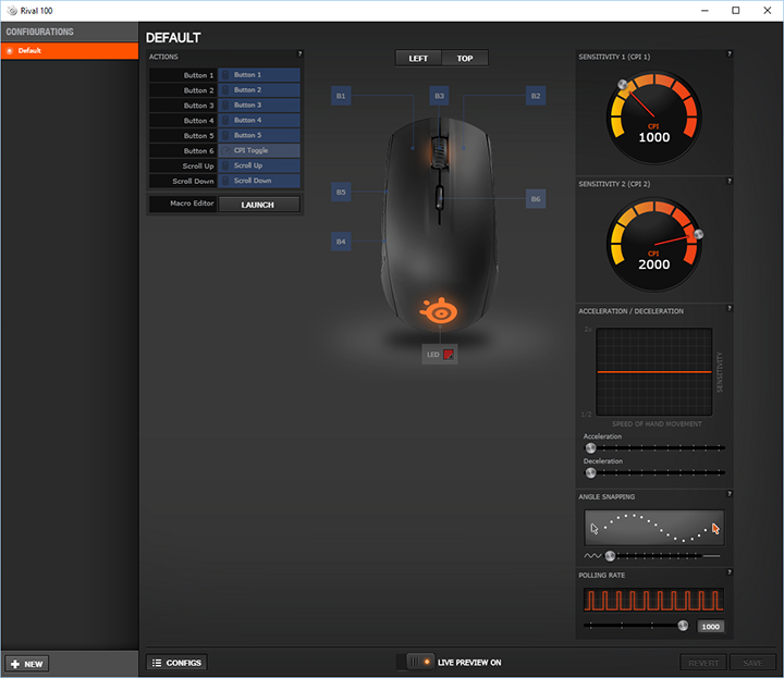 Lastly, the right column features a bunch of mouse characteristic controls, which should be pretty self explanatory. Simply drag the sliders and dials to configure to your heart's desire. You cannot enter the sensitivity value directly into the field located at the center of the CPI meter, as you are bound to eight presets only, which is 250, 500, 1000, 1250, 1500, 1750, 2000, or 4000 CPI. Overall, I found SteelSeries Engine 3 to be very straightforward and intuitive to use. The graphics are also quite appealing to look at, making the overall experience very good.