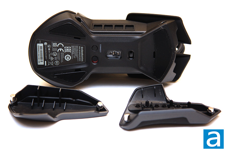 Measuring in at 131mm depth, 69mm width, and 43mm height, the SteelSeries Rival 650 Wireless is pretty standard when it comes to physical dimensions. The 121g weight of SteelSeries's pointing device is even adjustable; a rare feature in today's mice, never mind wireless versions. In fact, this is the first time encountering a weight-adjustable wireless mouse. 121g is pretty light for a wireless mouse, but you can customize it up to 153g; more on this later. This is almost the same weight as the Sensei Wireless, a mouse I used daily until I changed to the ROCCAT Leadr in August 2017. Based on these numbers, you can see the mouse is built for small to average sized hands. I am a palm grip type user myself, and the SteelSeries Rival 650 Wireless fits quite well. Just for fun, I gave it a claw type grip and it is not bad to use it at all. My hand size is pretty average, so this is good news for majority of the users. Its surface material is composed of a black soft touch finish, while the core construction is fiber-reinforced plastic. All surface material is part of the shell. In other words, they are not simply stickers -- the surface is molded this way from the factory. Overall, I found the Rival 650 Wireless very comfortable to touch and maintains great control and grip even if your hands are particularly sweaty in the summer. The only downfall is fingerprints will show up. The build quality is also excellent across the board with no sensor rattle.