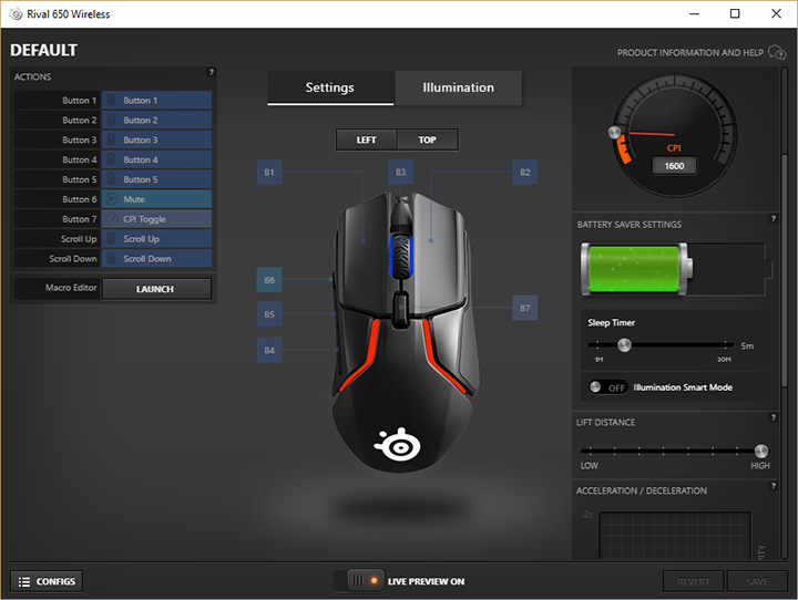 The main screen of the software has three tabs. The first tab, labeled Gear, shows all your compatible SteelSeries device. The second tab, Apps, allow you to install or even make your own applications compatible with your SteelSeries devices. The third tab, Library, allows you to automatically switch profiles when certain programs are launched. Our screenshot above shows the configuration screen for the SteelSeries Rival 650 Wireless. The graphical user interface is basically separated into three columns; the left side allows you to configure the function of different buttons, as labeled on the photo of the mouse in the middle column. Hit the Launch button next to the Macro Editor and a new window will pop up to allow you to record your own macros. You can also configure the function of the buttons by clicking on the labels of the mouse itself. You can switch to a left view from the default top view of the mouse for a better view of the two side buttons. To switch between profiles or create new profiles, simply hit the "Configs" button at the bottom and a fourth column will slide in from the left. As far as lighting effects are concerned, hit the Illumination button and you be setting up illumination color and effect in no time.