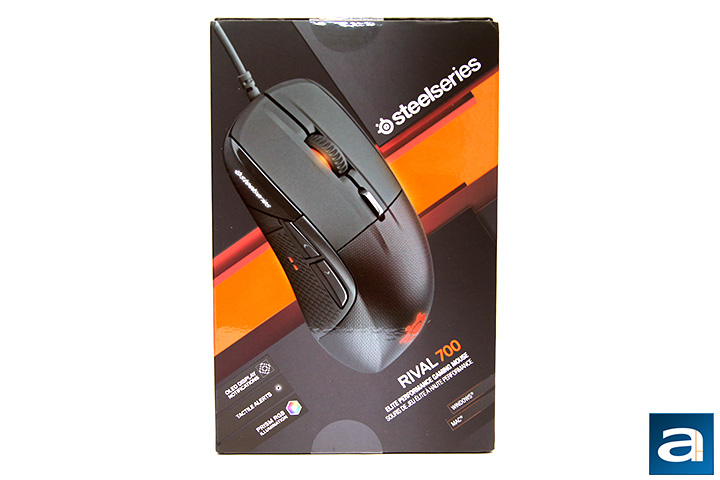 The retail box design for the Rival 700 carries forward the company's latest design theme first seen in the Rival 100. The revised layout and format is more stylish and modern; the black and dark grey background is accentuated by a sharp orange band crossing at an angle, complete with predominantly white text printed on the box all oriented at the same 45-degree angle. A photo of the mouse itself can be seen occupying the majority of the box. There is one slogan that describes the SteelSeries Rival 700 in front, and that is "Elite Performance Gaming Mouse" in two different languages. More detailed descriptions are at the back. If I were to see the SteelSeries Rival 700 in a retail store, I would not mistake it for any other brand.