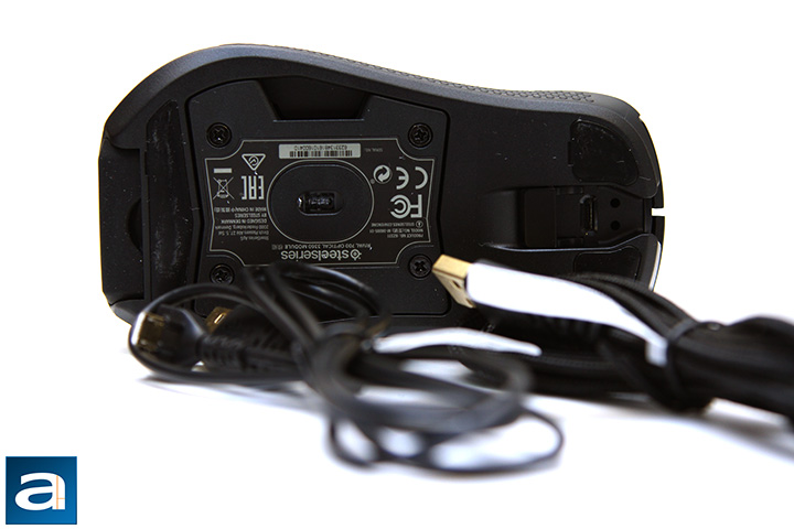 At the back if the mouse is an interchangeable nameplate. By default, it says "Rival". The nameplate is held in the mouse by friction only, so if you want to swap it out, simply pry it out with your fingernails. The main marketing call for the interchangeable nameplate is you can make your own with a 3D printer thanks to an included model. I am willing to bet 99% of the users who have this mouse do not have access to a 3D printer, and 99% of that 1% who does have access to a 3D printer probably do not know how to use it, or will not bother to make a custom nameplate, but this is a story for another day.