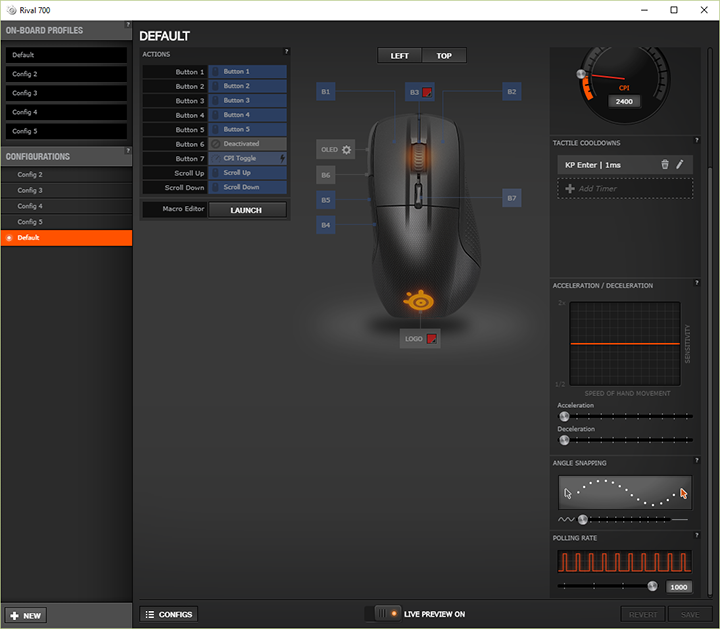 The SteelSeries Rival 700 is powered by a PixArt PMW3360 optical sensor capable of sensing up to a jaw-dropping 16,000 DPI (CPI in SteelSeries language) sensitivity, but can drop as low as 100 DPI at 100 DPI increments for those who want it. It promises true 1:1 tracking with zero hardware acceleration. 1000Hz polling rate is standard, but can be lowered to 500Hz, 250Hz, or 125Hz. If you do not like the PixArt PMW3360 optical sensor, you can swap it out yourself by buying a PixArt 9800 laser sensor module from SteelSeries for $25. This time around, there is onboard memory for up to five independent profiles, so any custom settings you make will be saved on onto your mouse. Combined with SteelSeries Engine 3, you can synchronize it to the cloud as well, which is the best of both worlds in my opinion.