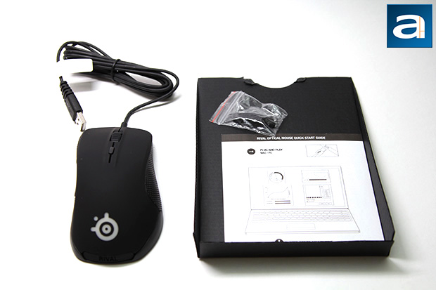 Out of the box, you will receive the SteelSeries Rival mouse, along with a quick start guide. A plastic bag that contains a second user interchangeable nameplate -- more on this later -- is the only accessory included from the factory. A sticker attached to the end of the USB cord instructs the user to go to SteelSeries' website to download the latest software from the company's website. The file size of SteelSeries Engine 3.20 (The latest version at press time) is 45.8MB, but I am willing to bet a vast majority of the users who are interested in this mouse will have a reasonably fast internet connection at home. After all, it is 2014, not 2004, haha.