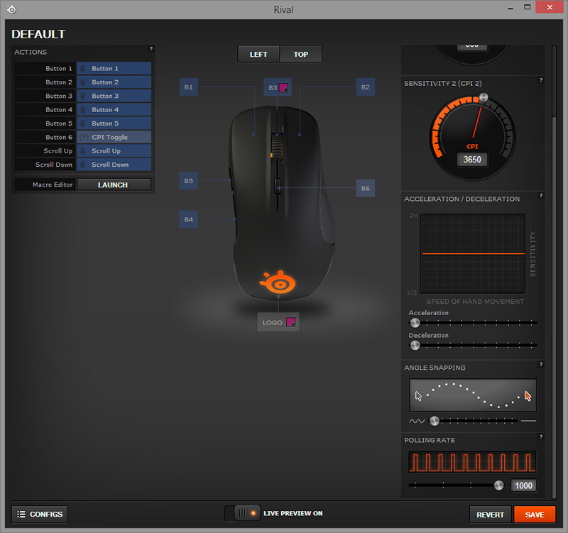 The SteelSeries Rival is powered by a Pixart PMW3310 optical sensor capable of up to whopping 6500 DPI (CPI in SteelSeries language) sensitivity, but can drop as low as 50 DPI for those who want it. It promises true 1:1 tracking with zero hardware acceleration. 1000Hz polling rate is standard, but can be lowered to 500Hz, 250Hz, or 125Hz. There is no onboard memory, so any custom settings you make will be saved on your hard drive. Thankfully, you can synchronize it to the cloud, but it will require you to install SteelSeries Engine on every computer you plan to run the Rival on. Since most people are quite happy with custom software running on their computer, I think it is a pretty sensible alternative to having onboard memory.