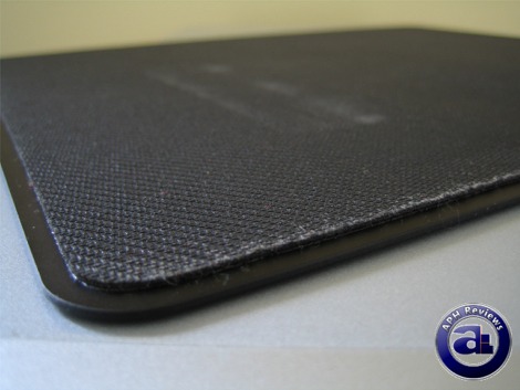 At 2mm thickness, the SteelSeries SX is constructed of two distinct, but three separate layers. The mousing surface itself is black colored fiber polished aluminum; with a layer of adhesive visible from the side above the large rubber grip backing. The adhesive and rubber backing do in fact add height to the overall product, although generally acceptable -- thinner grips could be implemented to reduce height as demonstrated with Func's sUrface 1030 Archetype series.
