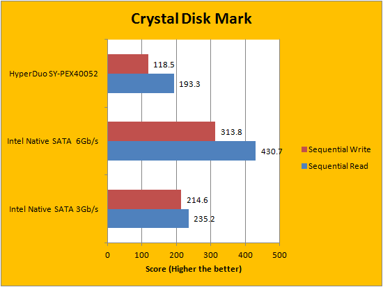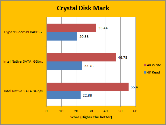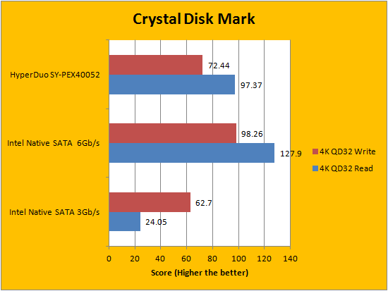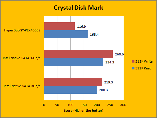 Crystal Disk Mark 3.0 is in the spotlight. Just a bit of background information; usually with higher capacity drives, especially when put in RAID 0, it will pack quite the punch. Taking a look at the results, we can see that the SYBA HyperDuo is pretty consistent in its performance. All of the results from the first three tests show that the write and read scores are still mostly below Intel 3Gb/s supplied by the chipset. As a 6 Gb/s controller, I would have expected the results to be a little bit closer to the Intel SATA 6Gb/s ports, haha. Clearly, this is not the case from the tests. Having said that, I was slightly surprised to see that the results from the 4K QD32 test wer better than the 3 Gb/s results in the same benchmark. Again, do keep in mind that the SYBA HyperDuo is using one PCIe x1 slot only, and such results may decrease further with more drives connected.