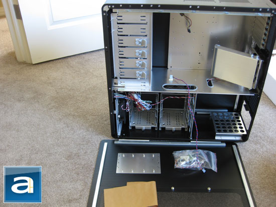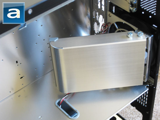 The power supply chamber at the bottom is surprisingly large. Extending the entire height of the bottom chamber, most of the space won't be used in that particular area. Two 80mm fans can be added above the power supply to enhance airflow though, since up to eight hard drives can be placed in the other half of the chamber. The power supply is risen slightly from the bottom with large holes to accommodate power supplies with a bottom mounted 120mm fan.