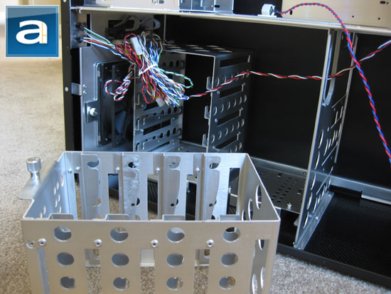 The front portion of the bottom chamber contains two hard drive cages; each able to accommodate up to four drives for a total of eight. Hard drives are to be placed horizontal in relation to the chassis. Vibrational dampeners can be installed to reduce vibrational noise. It's not tool free, but the cage attachment to the case is, thanks to the thumbscrew. A thin panel separates this half of the bottom chamber with the power supply area, with tons of openings to allow air and cables to easily go through.