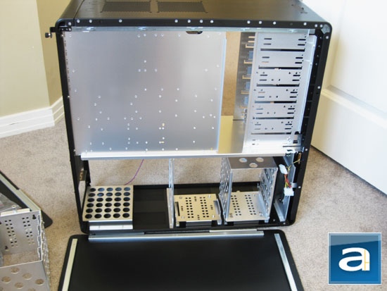 Opening the right windowed side panel of the Tagan A+ Black Pearl WCR allows majority access to the inside of the case. Like many high end cases of this segment, it incorporates a dual chamber design to separate the hard drives and power supply from the motherboard and other directly connected hardware. The platform separating the top and bottom chamber has two openings to allow the user to pass cables through. On the platform itself is the case speaker -- I found it odd to be placed there, so I ended up moving it to a place that cannot be seen when looking inside from the case window.