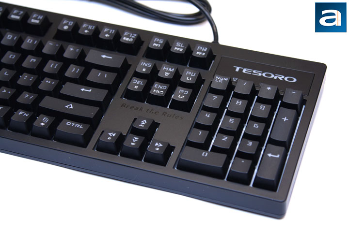 As I have mentioned before, the Tesoro Excalibur SE Spectrum is likely to be designed by people with only a ruler. From the above picture, we can clearly see that the keyboard is composed of all straight lines. There are no round lines I can find on it. This is what the Excalibur series is all about; if you want something a little more out there, look for something like the Gram Spectrum. With the matte black color, the keyboard has a very obvious stealth look. For a gaming keyboard, there is nothing wrong with such a low-key and conventional design, since winning a battle is everything, and everything else is unnecessary, right? In front of the arrow keys is the company’s slogan, "Break the Rules". Considering the conventional design, I suppose the only rule that Tesoro breaks is a gaming product has to be fancy in looks, especially with all the RGB LEDs today. By the way, this keyboard does not have a palm rest. If there is a rule that says, "A good keyboard should have a palm rest," then I believe Tesoro definitely wants to break it, haha.