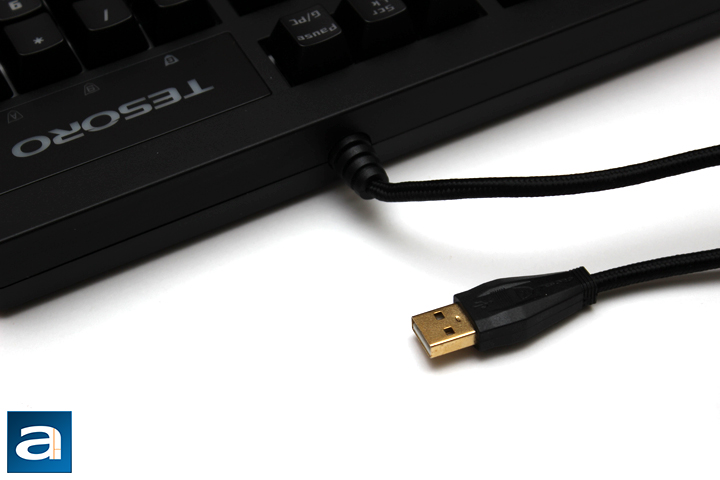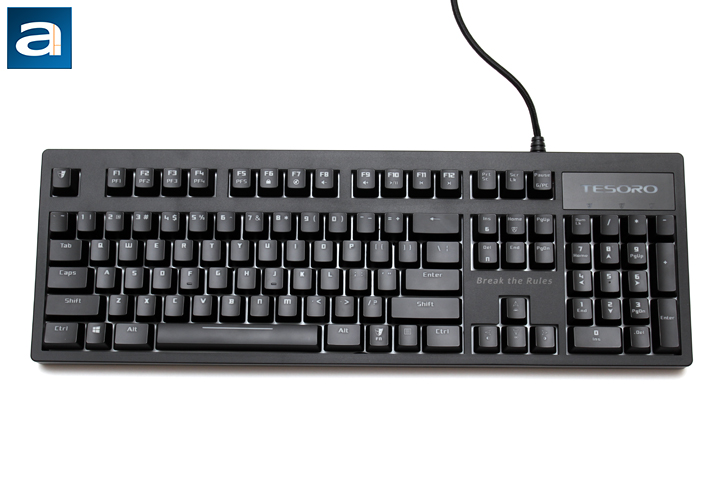 Taking a look at the keyboard itself, the Tesoro Excalibur Spectrum is the least outlandish design Tesoro has ever implemented for their mechanical keyboards. From the first review sample they sent us, the Tizona, I thought this company only did funkier designs, but the Excalibur takes a page from practically any classic keyboard out there. Considering it holds a name like Excalibur, I expected something a bit crazier. On the other hand, I am glad they have returned to something more conventional in terms of keyboard design. For once, it has no oddly textured surfaces, or distracting eye-catching colors. In fact, this design is even more normal than the already conservative looking Cooler Master Storm QuickFire Pro. The entire top is plastic and coated with a standard black-matte finish. The only place we see some Tesoro branding is at the top right hand side. Tesoro's slogan of "Break the Rules", which look very out of place on a keyboard that really does not break any rules, is found above the arrow keys. Overall, I really like the aesthetics of the Tesoro Excalibur Spectrum. I could easily bring this keyboard to a LAN party or to work without sticking out like a sore thumb in either locations. With all the flashiness out there from every keyboard manufacturer, it is refreshing to see a down-to-earth one.