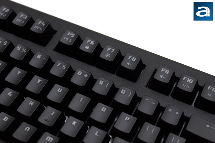 Our review unit of the Excalibur Spectrum is the standard QWERTY 104-key American English layout. This layout is practically the same layout we have seen for almost all our recent keyboards, with similar key sizing too. For example, the Enter key is half of its traditional size, and the backslash key is fifty percent larger than regular keys. Otherwise, the layout is quite traditional. On the top right hand side are three indicators, though there are a few differences here. Rather than the standard Num, Caps, and Scroll lock, Tesoro has removed scroll lock, and added a "Gamer Mode" indicator on the left-most side of the LEDs. This lets users know when they are in a custom profile they have made for themselves. In addition, this by default disables the Windows key, so gamers do not accidentally hit this switch, leaving them immobile and defenseless in the game. These are indicated by blue LEDs, though it would have been nice to see the same RGB lights underneath here, just to match with the rest of the profile. Under all of the function keys, we have different actions, and they are activated by pressing the "Fn" key in conjunction with a function key. F1 to F5 allow users to quickly change between their five profiles. F6 allows users to disable the Windows key. F7 to F12 are media functions, and from left to right they are Mute, Volume Down, Volume Up, Play/Pause, Previous, and Next. Other keys can be activated with the "Fn" key for other functions, which I will highlight these. For example, the Home key is used to quickly record macros, and it generally works quite well. Pause is used for switching back from a profile to PC Mode. The left and right arrow vary the backlight brightness, while the up and down arrow cycles through the backlighting options, both of which we will look at later.