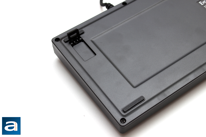 Underneath the Excalibur Spectrum, we see the base of it exposed. Once again, there are four areas padded with rubber grips, which hold the keyboard well in place without shifting around. Two flip-out risers are also found, and they have two positions when extended to allow users for different heights. The feet of the risers are also rubberized, which is very good to see. This means even when extended, the keyboard should not shift too much. Combine these facts with the under 1.2kg mass, and this keyboard will most definitely stay in place. This is pretty regular for most keyboards here, and the Excalibur Spectrum is par for the course.